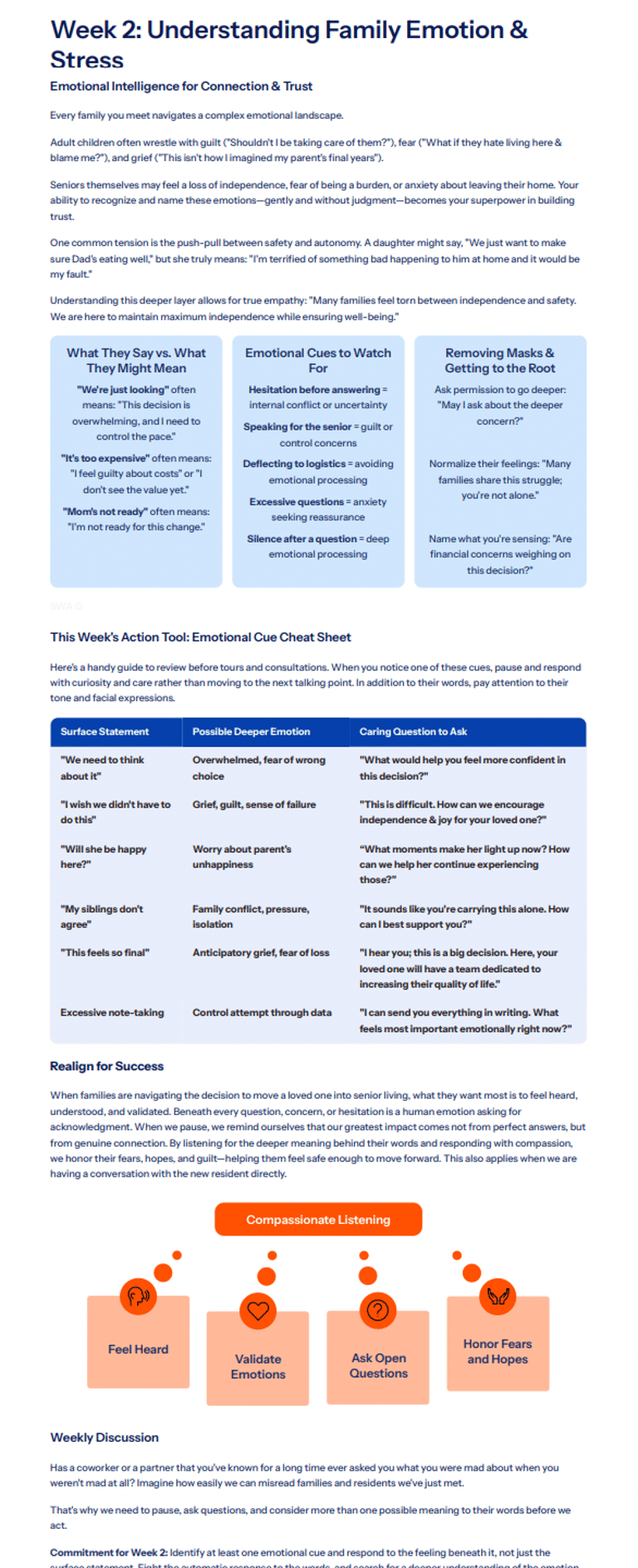 Over this 8-week journey, participants meet weekly (or self-pace) while building a powerful toolkit that transforms the entire sales approach—from the first contact to the final decision. Each week features concise lessons, practical exercises, reflection prompts, and real senior living scenarios that can be applied immediately.